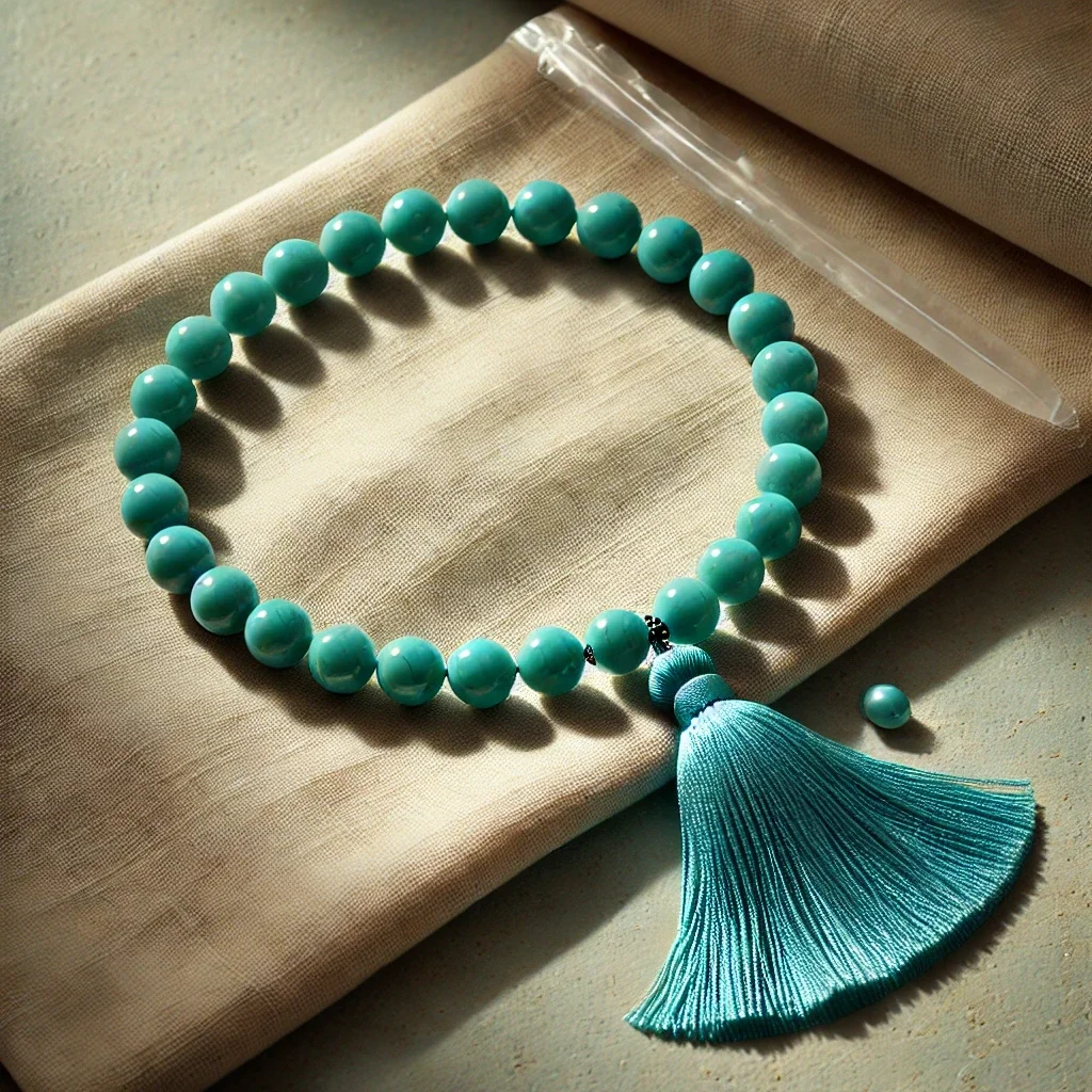 Ce collier est un magnifique chapelet de perles turquoise, confectionné avec soin pour un look élégant et apaisant. Les perles sont rondes et parfaitement polies, offrant une douce brillance qui capte la lumière. À la fin du chapelet, un pompon assorti en soie turquoise est soigneusement enveloppé, ajoutant une touche bohème chic à l’ensemble. Ce collier est parfait pour accessoiriser une tenue décontractée ou pour apporter une touche de couleur à une tenue plus formelle.
