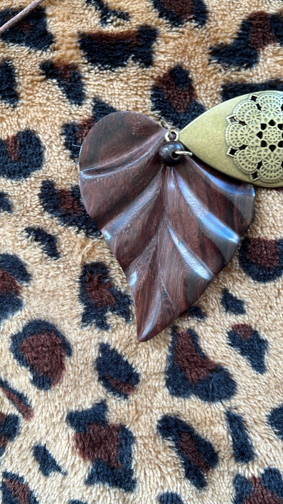 Ce collier unique, conçu spécialement pour une amie chère, est entièrement fait à la main à partir de bois d'ébène, reconnu pour sa richesse et sa profondeur. Chaque perle a été soigneusement polie, et le pendentif en forme de feuille, finement gravé à la main, reflète la nature délicate et intemporelle de cette pièce. La goutte en laiton, ornée d’un motif complexe, ajoute une touche d’élégance et d’authenticité. Ce collier n’est pas seulement un bijou, mais un symbole d’amitié et d'attention, incarnant la beauté naturelle et l’artisanat raffiné. Il a été conçu pour capturer l'esprit de la personne à qui il est destiné, avec amour et dévouement.
