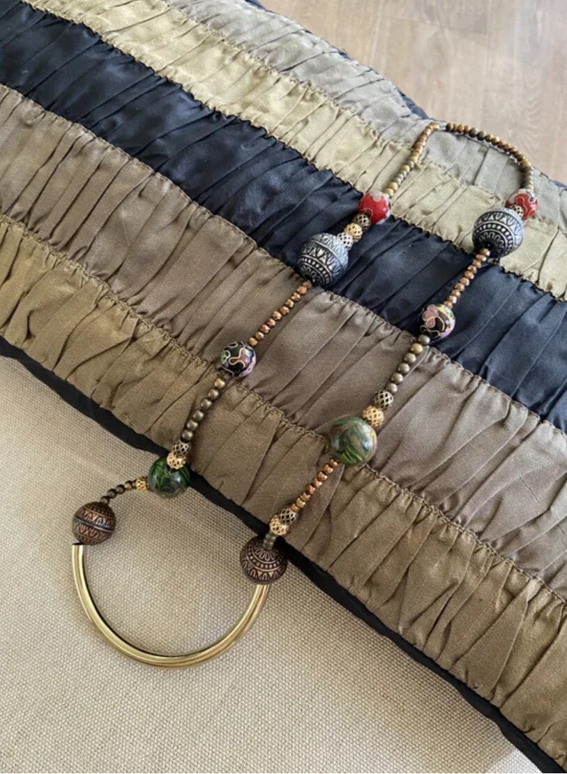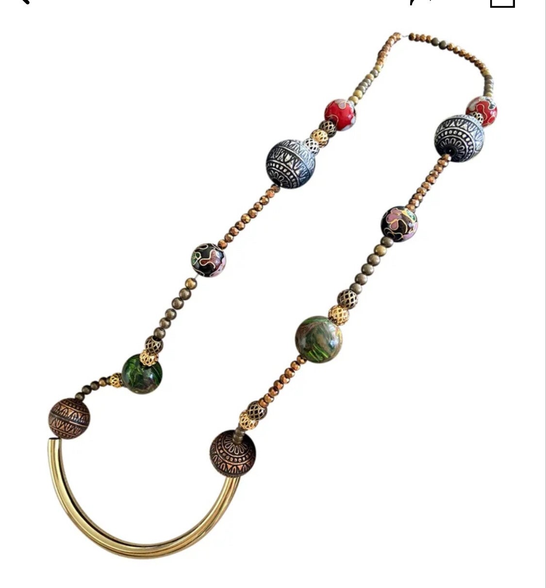 Ce collier audacieux réinvente le luxe artisanal à travers un mélange fascinant de perles texturées et de motifs tribaux. Chaque perle, soigneusement choisie, raconte une histoire, des influences culturelles à travers le monde, des lignes graphiques aux touches de rouge profond et de vert marbré. La pièce maîtresse, un arc en métal doré, offre une structure contemporaine qui équilibre parfaitement l’aspect traditionnel. L'association de détails dorés et de teintes terreuses crée un contraste saisissant, pour une allure chic et éclectique. Idéal pour celles qui souhaitent affirmer leur style avec une touche d'exotisme raffiné.