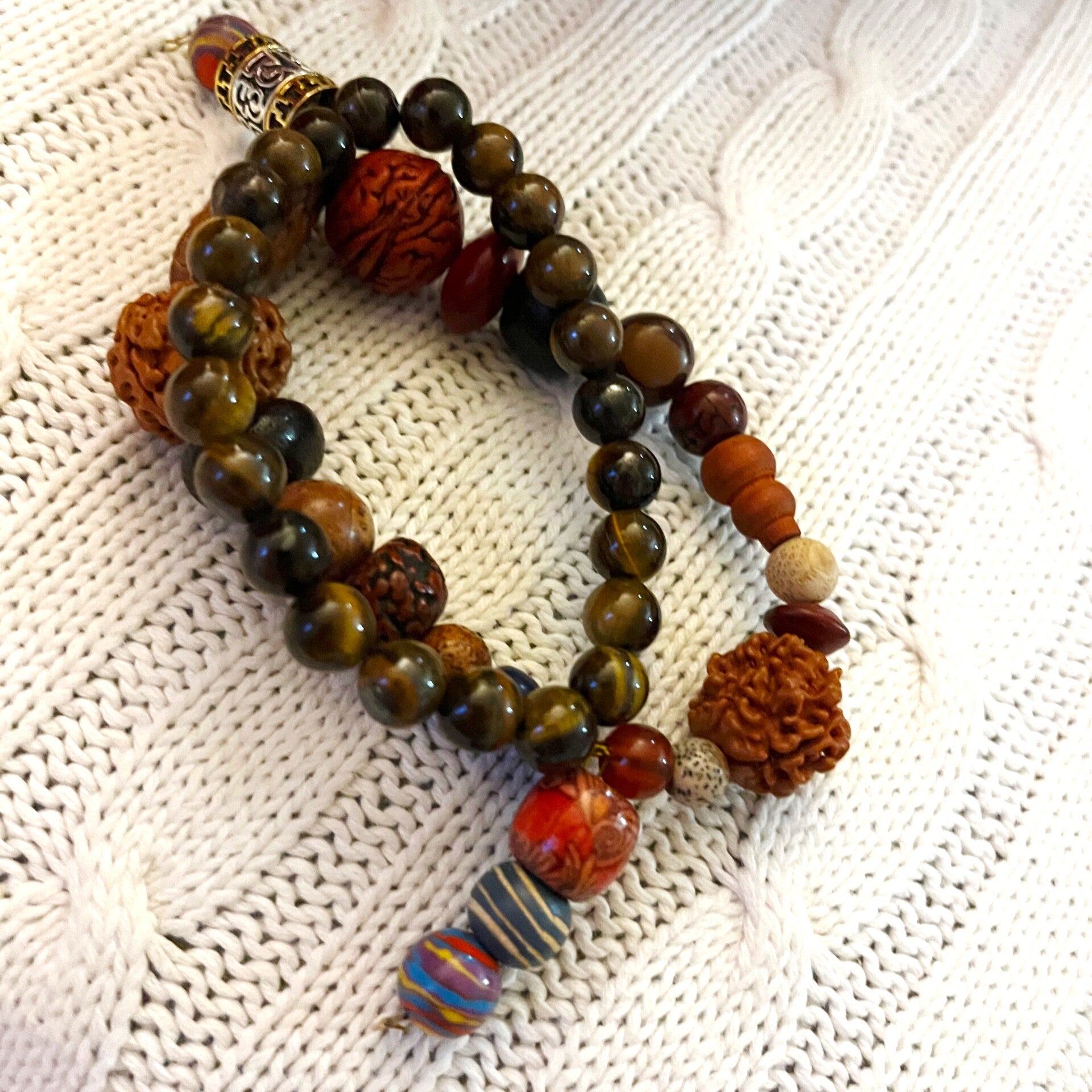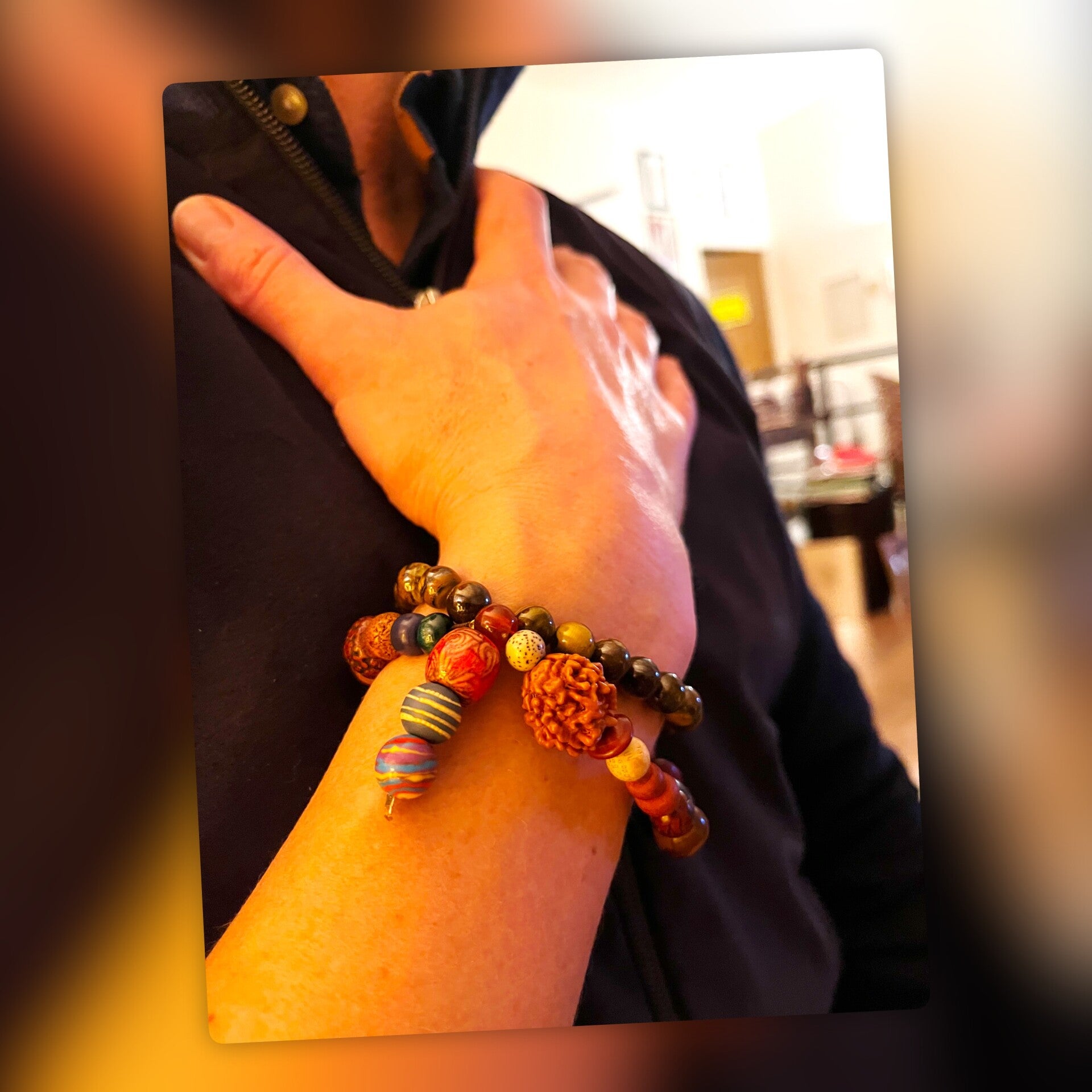 Perles colorées avec des motifs vibrants (rayures et textures) qui ajoutent une touche artistique et culturelle, soulignant un design masculin et intemporel.