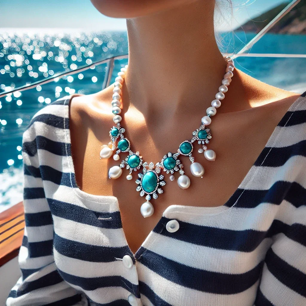 • Collier Azur Éternel : Une pièce maîtresse qui capture les reflets changeants de la mer, ornée de turquoises d’Iran et de perles nacrées.