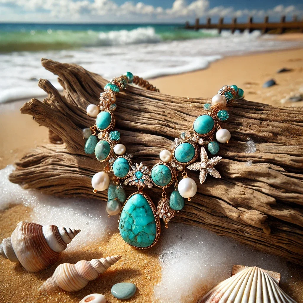 - Description : Ce collier minimaliste évoque les eaux limpides des lagons tropicaux, avec des pierres de turquoise disposées délicatement sur une chaîne en argent.