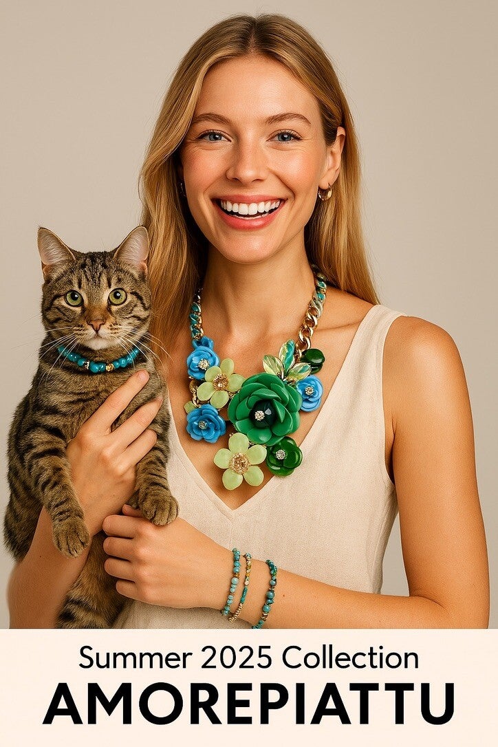 Ce jardin secret à porter autour du cou évoque une floraison éternelle, entre rêverie luxuriante et éclat solaire. Les nuances de vert profond, de jaune citron et de bleu lagon se mêlent en un bouquet généreux, audacieux, plein de vie. Il s’adresse à celles qui osent rayonner, qui portent la nature comme un talisman vibrant.