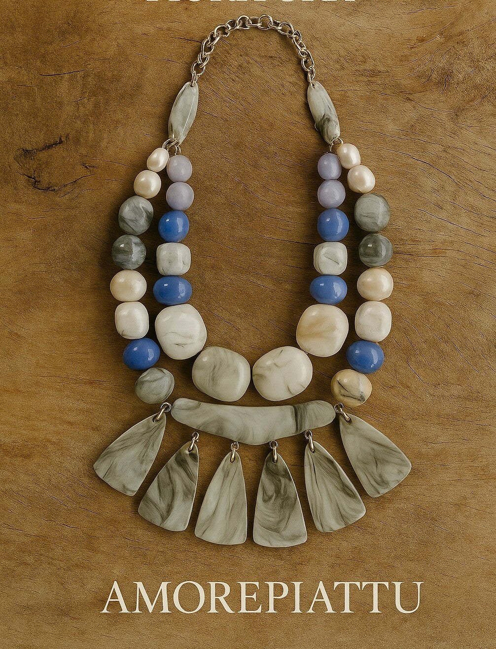 NEBBIA LAVANDA est un collier sculptural et minéral qui évoque les brumes douces d’un matin de printemps. Ses teintes nuancées de lavande, de bleu orage et de marbre blanc se fondent en un dégradé apaisant, presque onirique. Chaque perle, soigneusement sélectionnée pour sa forme et sa texture, semble polie par les éléments, comme des galets récoltés au bord d’un lac tranquille.