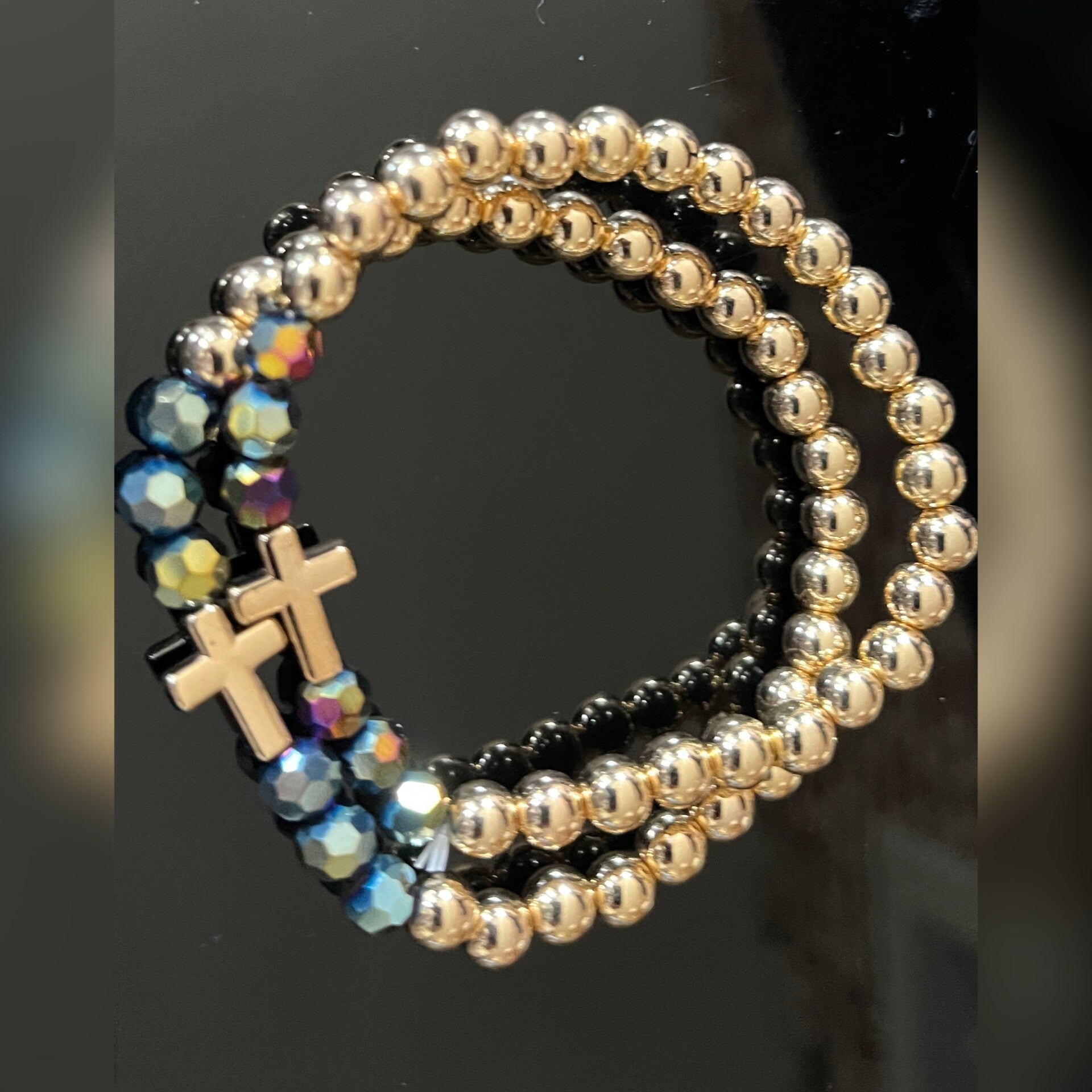 Audacieux et vibrant, ce bracelet double associe perles miroir multicolores, noir profond et croix dorée.