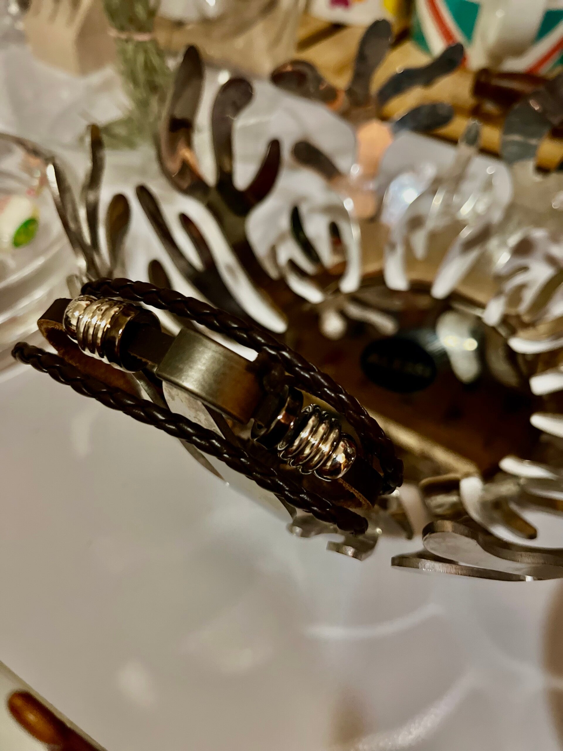 Alliance du cuir tressé et des détails en métal argenté vieilli. Une pièce forte au caractère brut, parfaite pour un look viril et affirmé.