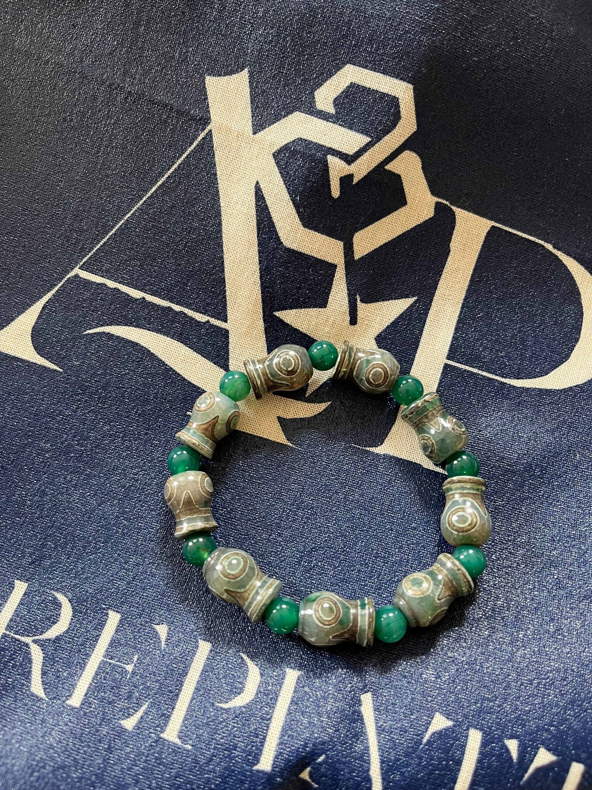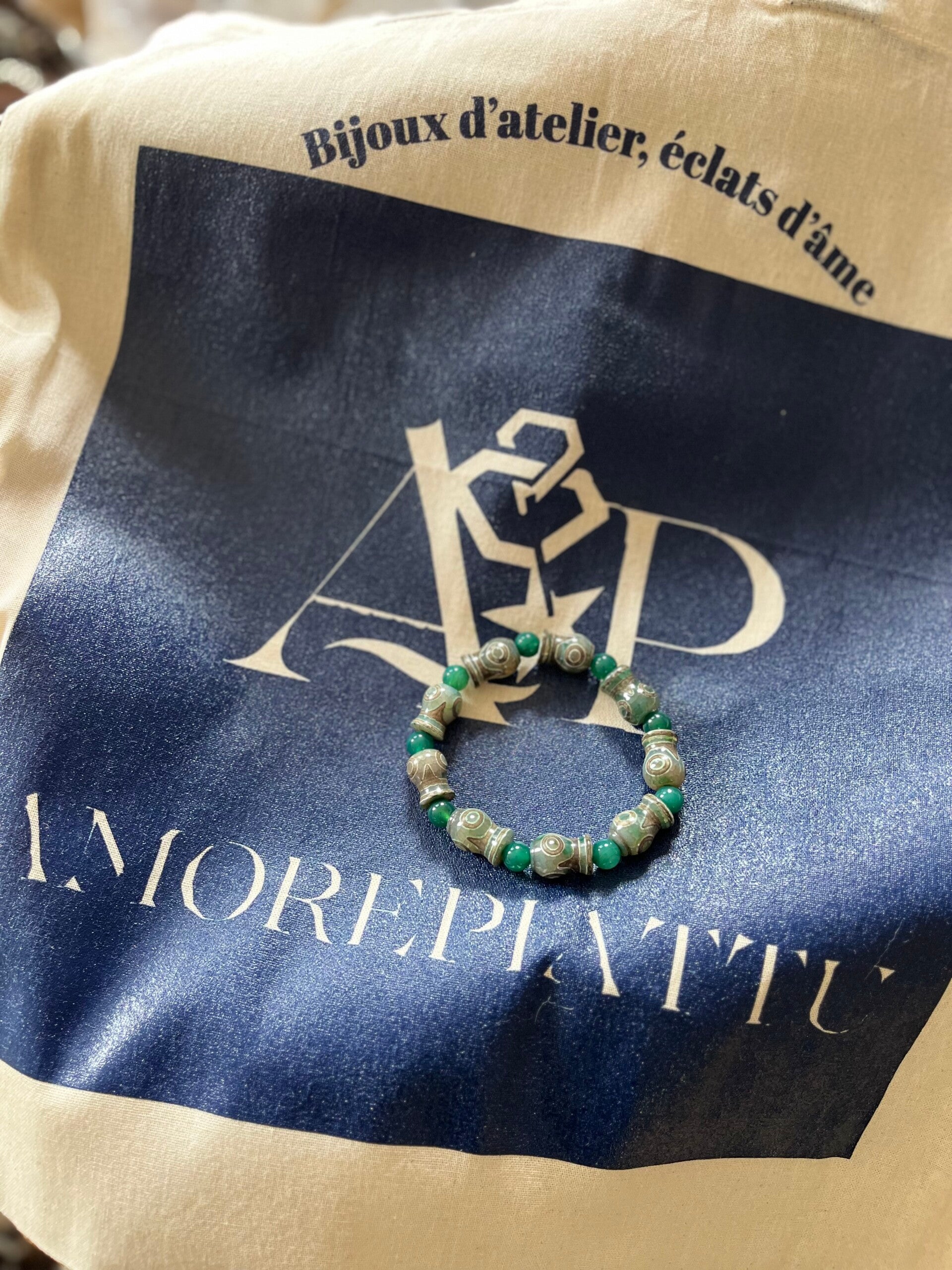 Perles artisanales sculptées (alliage patiné), agate verte naturelle, fil élastique haute qualité