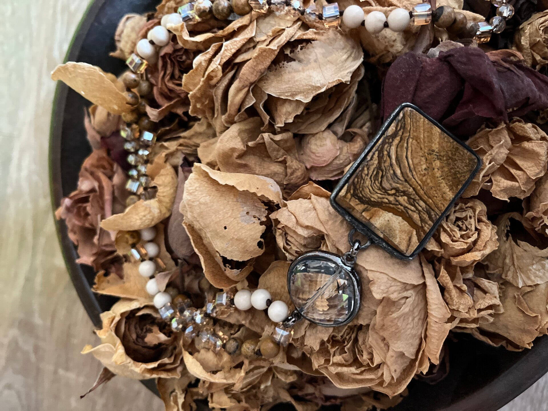 Un bijou à la croisée des éléments, entre force tellurique et lumière cristalline. Le collier Terra Cristallina marie la chaleur de la pierre naturelle à la clarté d’un cristal taillé, créant un équilibre subtil entre matière brute et éclat sophistiqué.