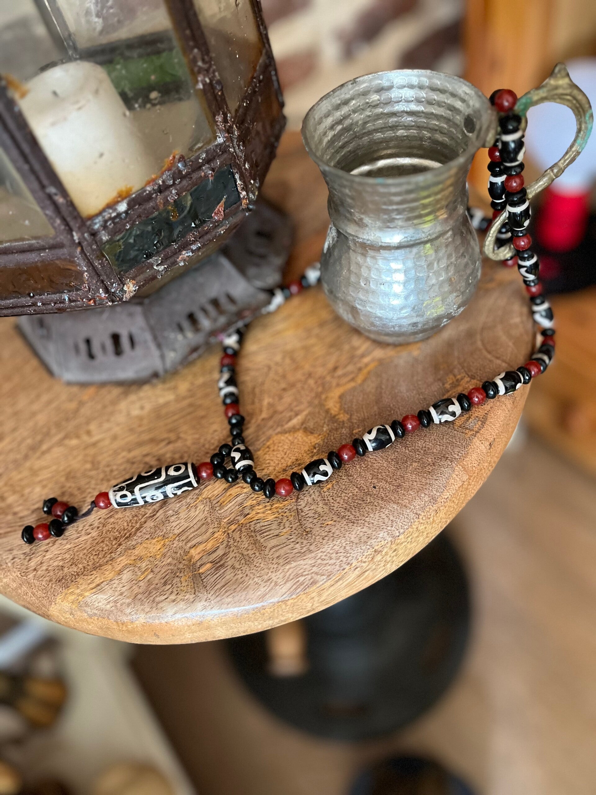 Chaque perle est une œuvre en soi : les motifs peints à la main racontent une histoire, une mémoire transmise à travers les générations. Les perles rouges, aux tons terreux, viennent ancrer cette pièce dans une chaleur puissante et intemporelle.