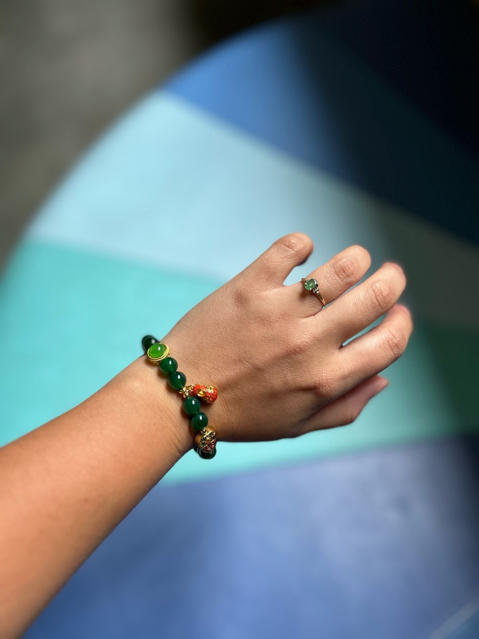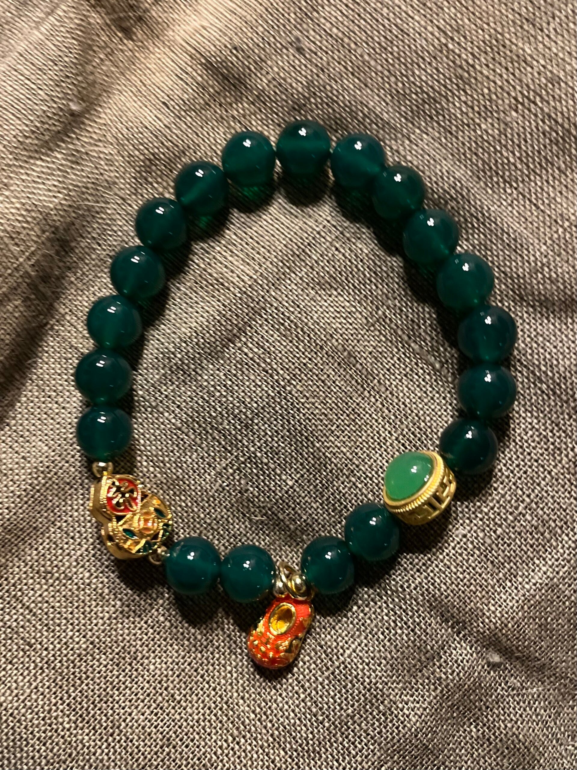 Ce bracelet raffiné marie l’éclat profond de perles vert émeraude à l’élégance symbolique de charms dorés et colorés inspirés de l’art asiatique. Chaque détail évoque une richesse culturelle :