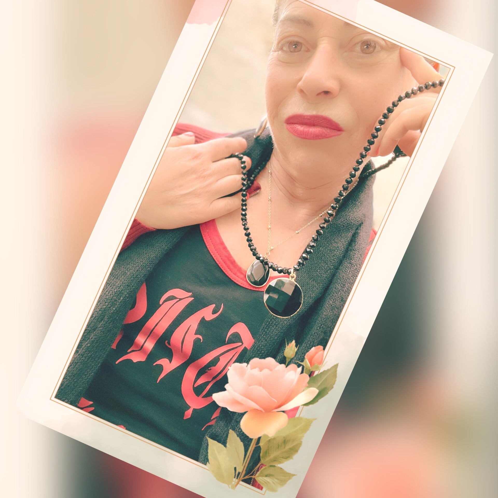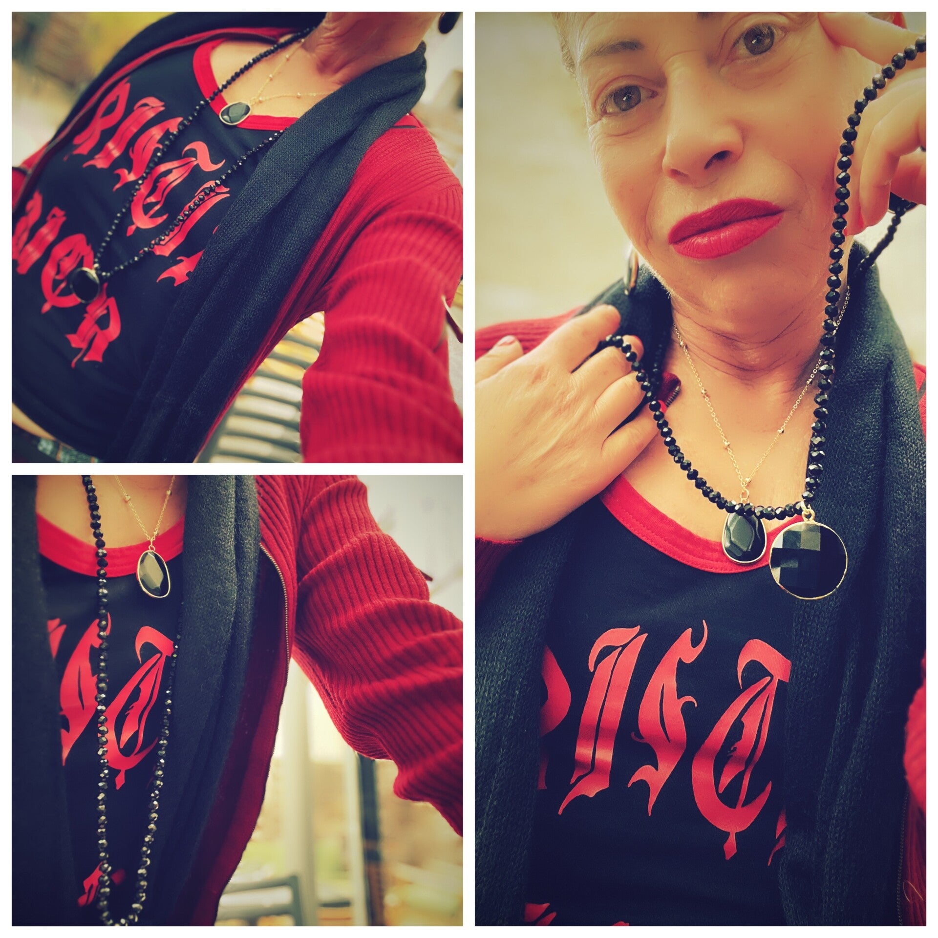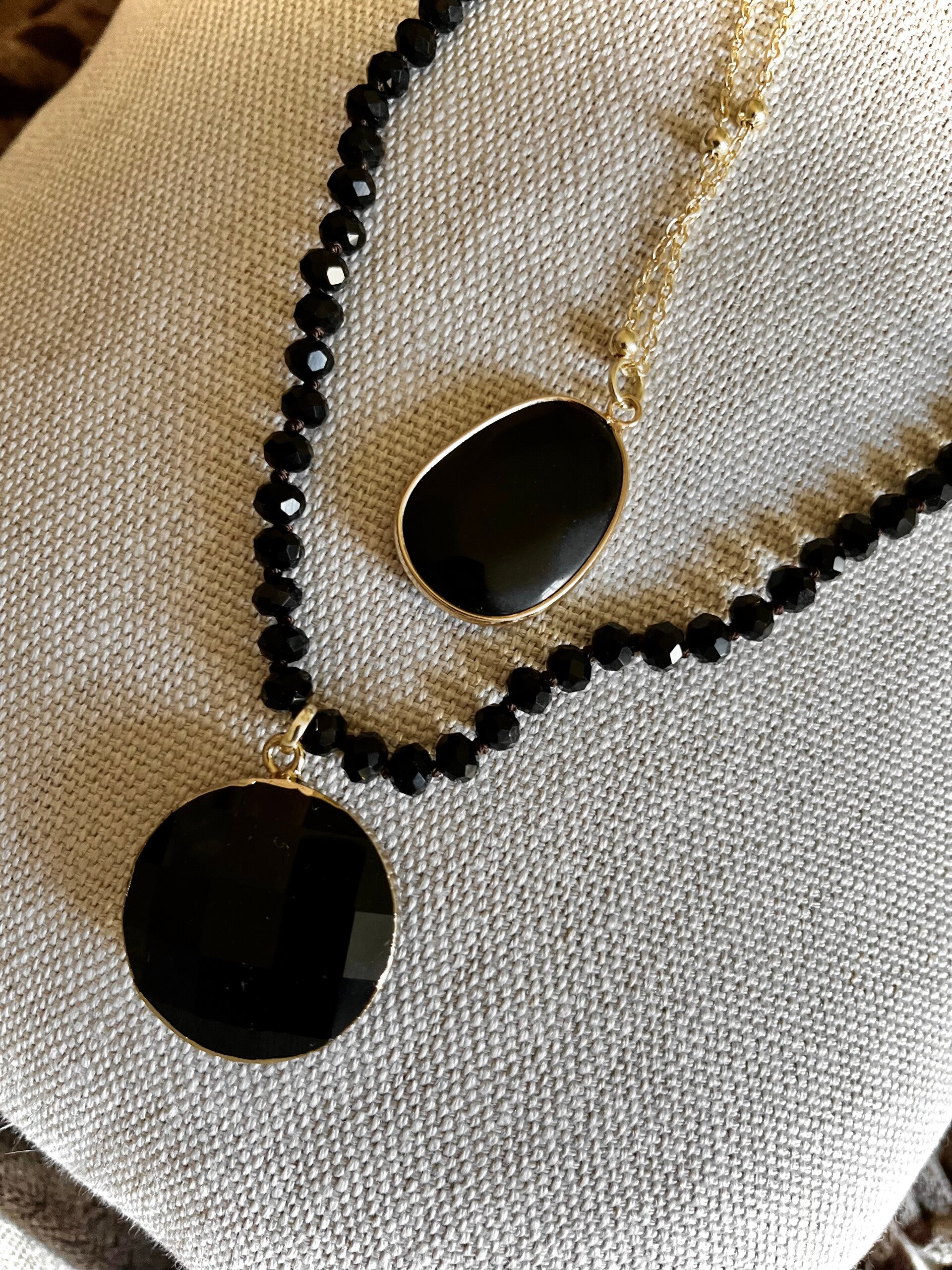 • Collier long : perles facettées noires profondes, montées à la main, avec pendentif rond facetté noir serti doré.