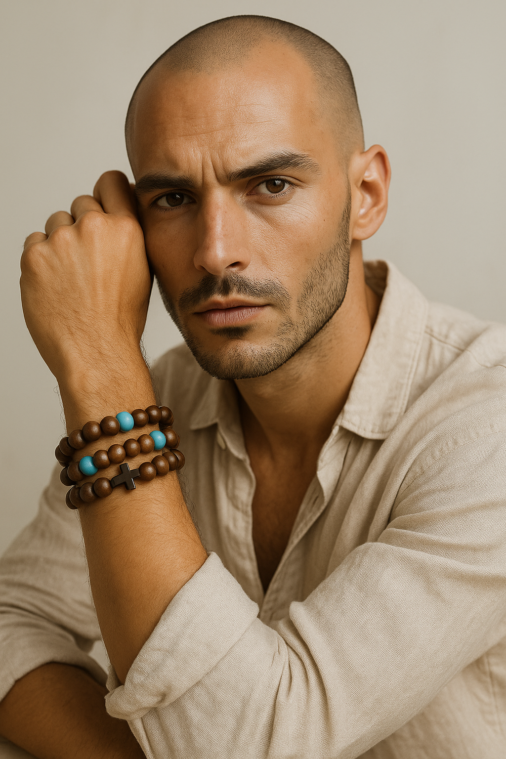 Ce trio de bracelets évoque la force tranquille de la nature et l’âme voyageuse. Réalisés en perles de bois aux teintes profondes et chaleureuses, chaque bracelet possède sa propre identité tout en s’harmonisant avec les autres. Des touches de turquoise apportent une note vibrante, tandis qu’une croix en hématite vient souligner la dimension spirituelle et symbolique de l’ensemble. À porter ensemble pour un effet audacieux, ou séparément selon l’humeur du jour.