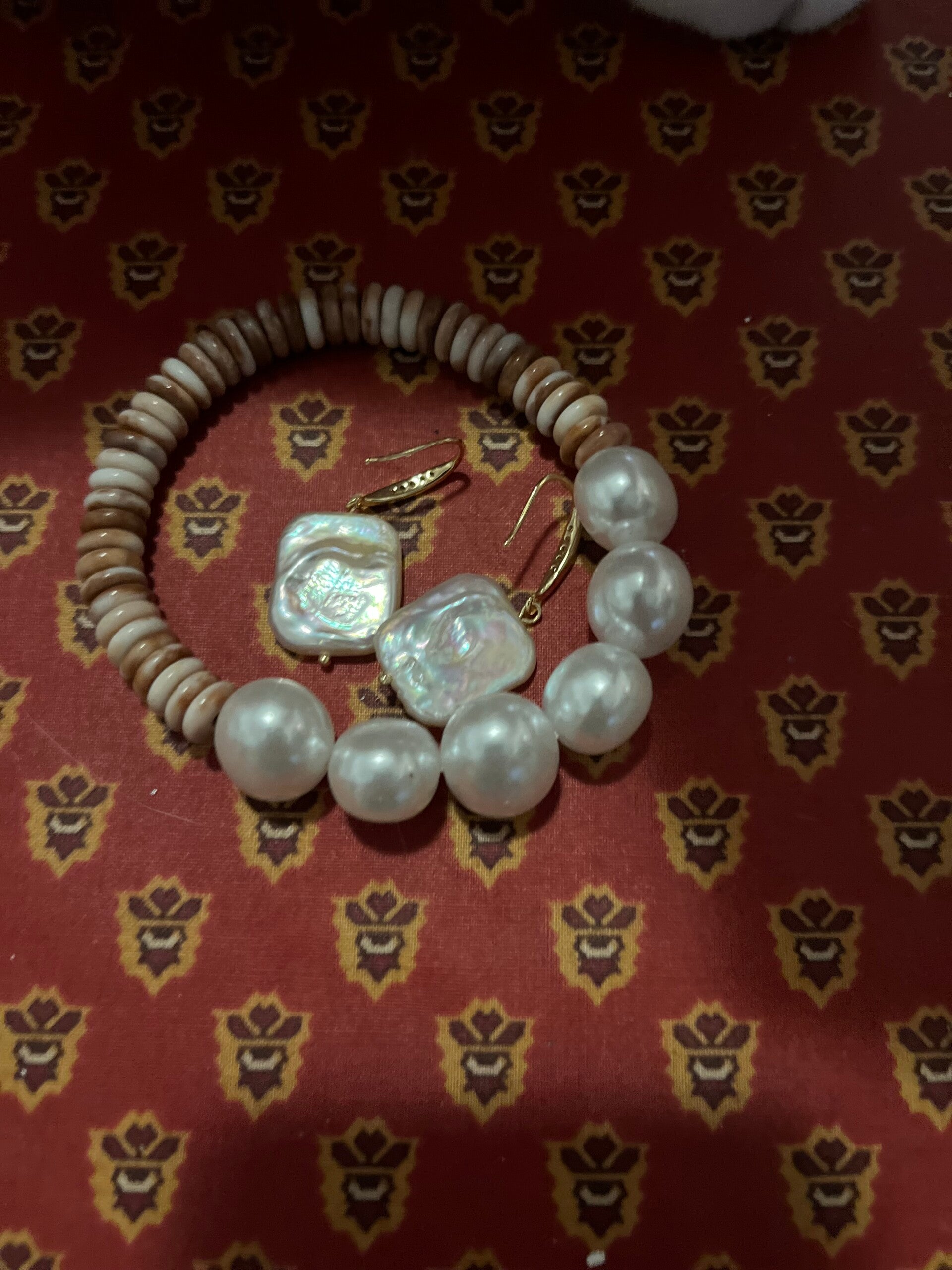 Un bijou solaire qui mêle la douceur nacrée des perles à la chaleur naturelle des tons sablés. Cette parure artisanale incarne un équilibre parfait entre élégance et naturel. Elle se compose :