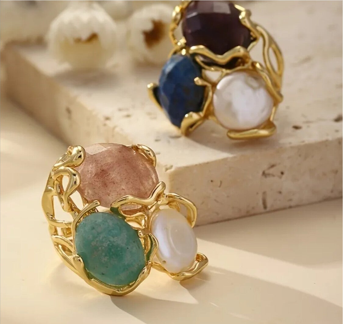 La bague Harmonia est un hommage à la beauté naturelle des pierres et à l’élégance des courbes dorées. Cette pièce audacieuse allie trois pierres semi-précieuses dans un design sculptural, ouvert et organique :
