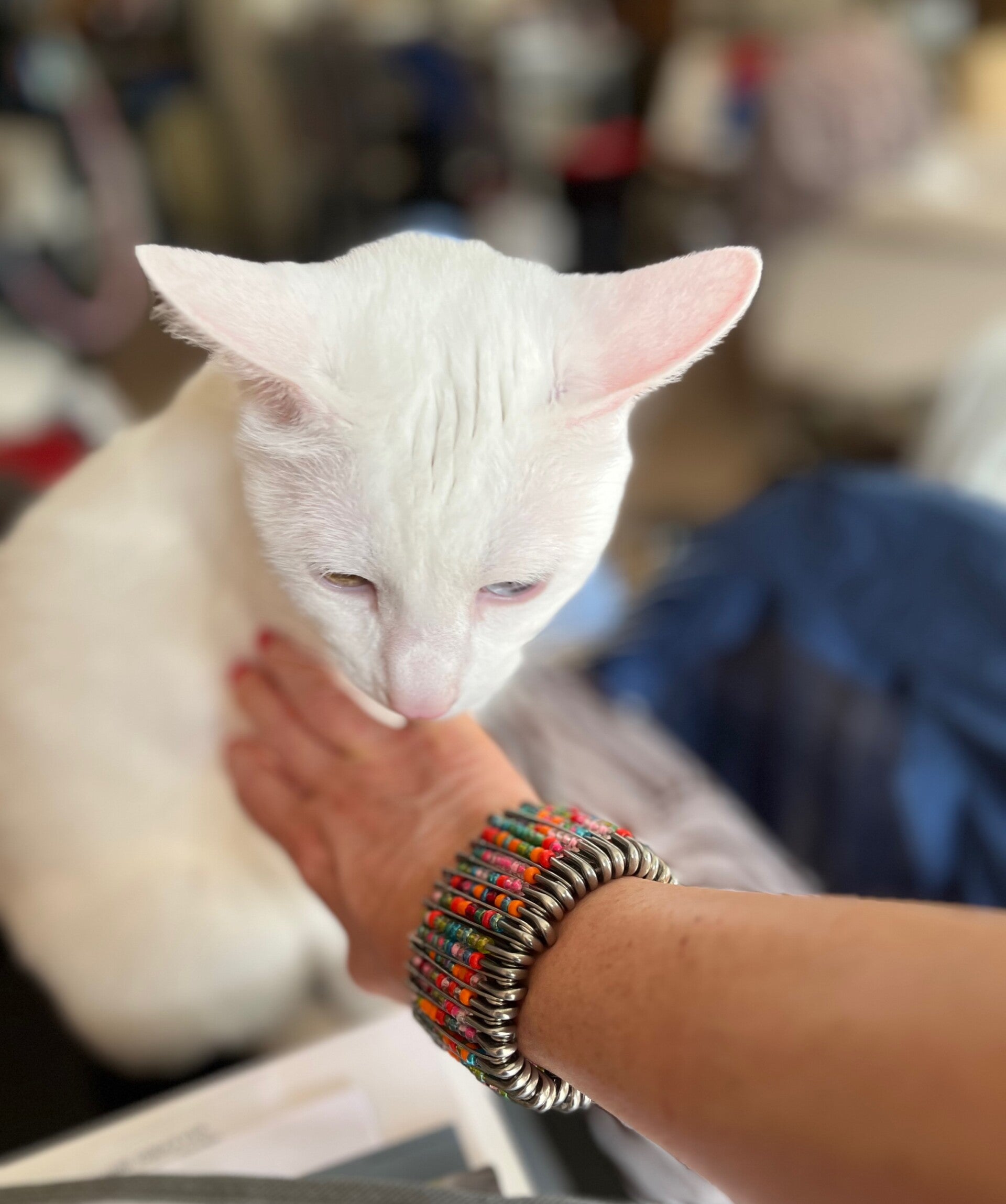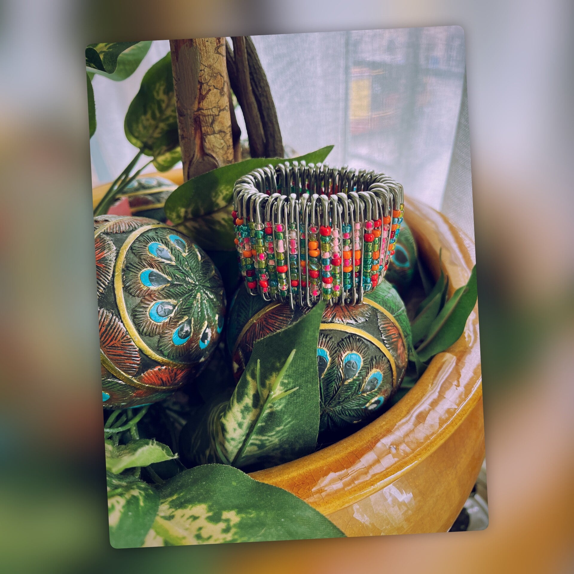 - Matériaux : Épingles à nourrice métalliques (pièces chinées des années 60), perles de verre multicolores (assemblage manuel)