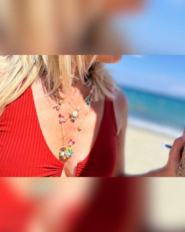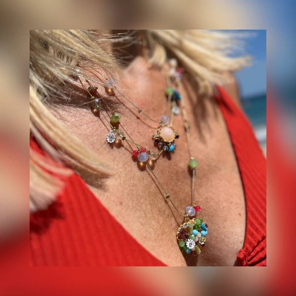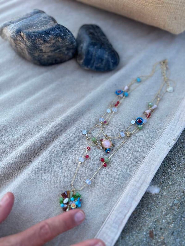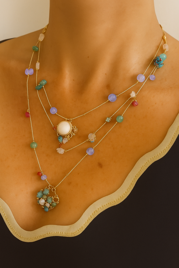 Ce collier unique à plusieurs rangs marie subtilement la finesse d’une chaîne dorée à des perles colorées et des pendentifs artisanaux. Chaque détail est travaillé à la main, créant une harmonie délicate entre élégance et esprit bohème.
