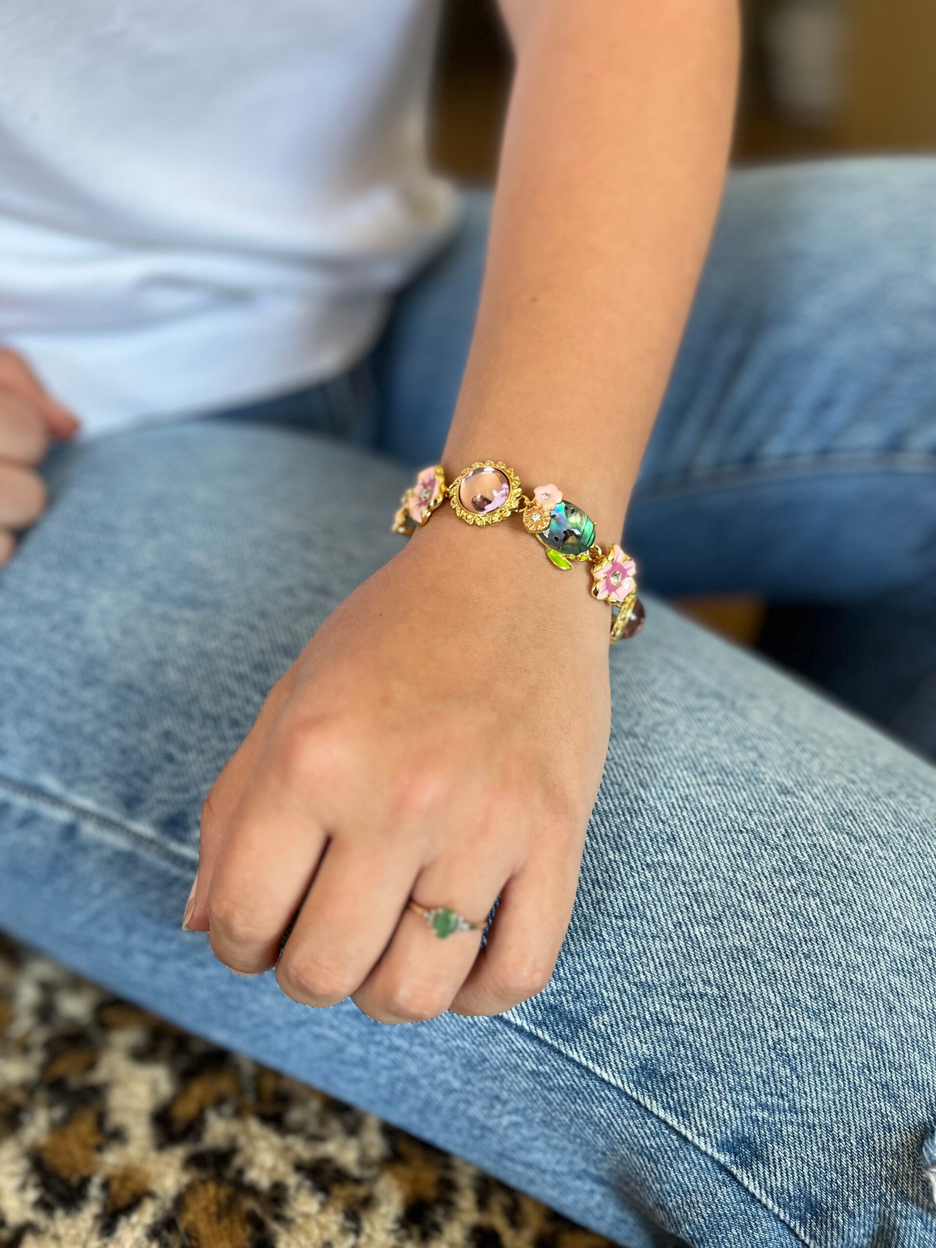 - Bracelet : orné de cabochons colorés (verts, violets, roses) et de délicates fleurs en relief, il joue avec la lumière et offre un effet chatoyant.